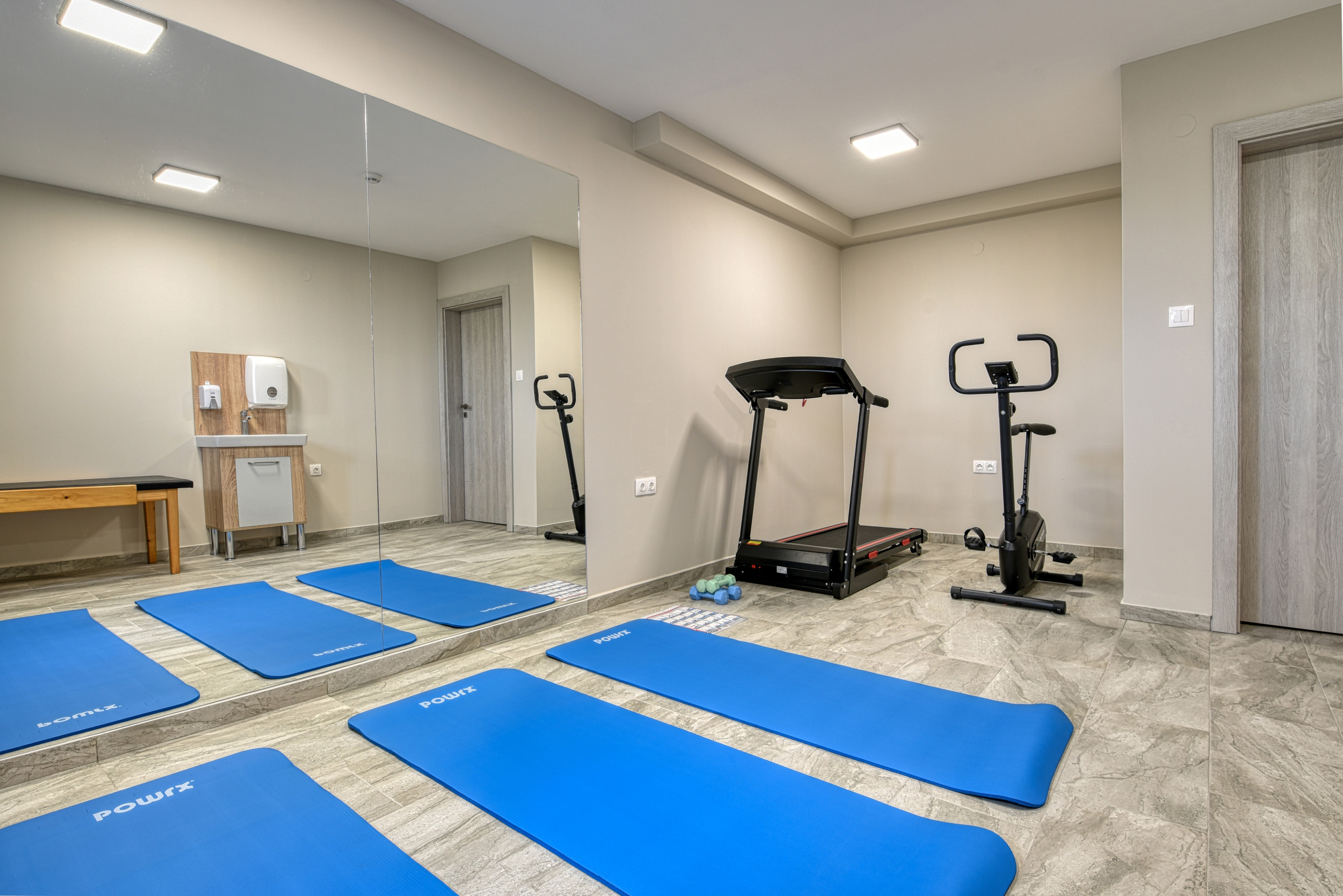 Оборудван салон за упражнения и раздвижване.